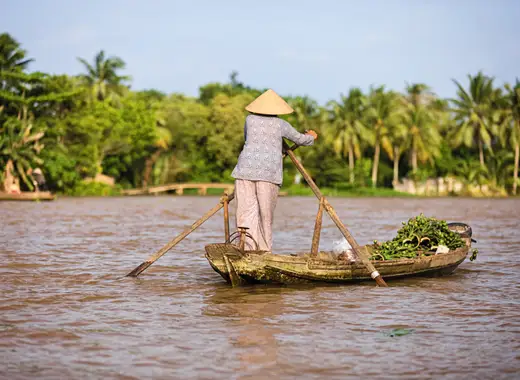Delta do Mekong: Navegue pelos canais do "rio dos nove dragões" e descubra o modo de vida tradicional das aldeias flutuantes.